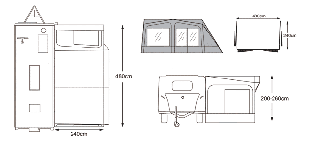 The awning also includes detachable front & side panels, allowing for a versatile and customizable setup. For extra comfort and privacy, curtains, an external privacy blind, and a rear support pad are included.