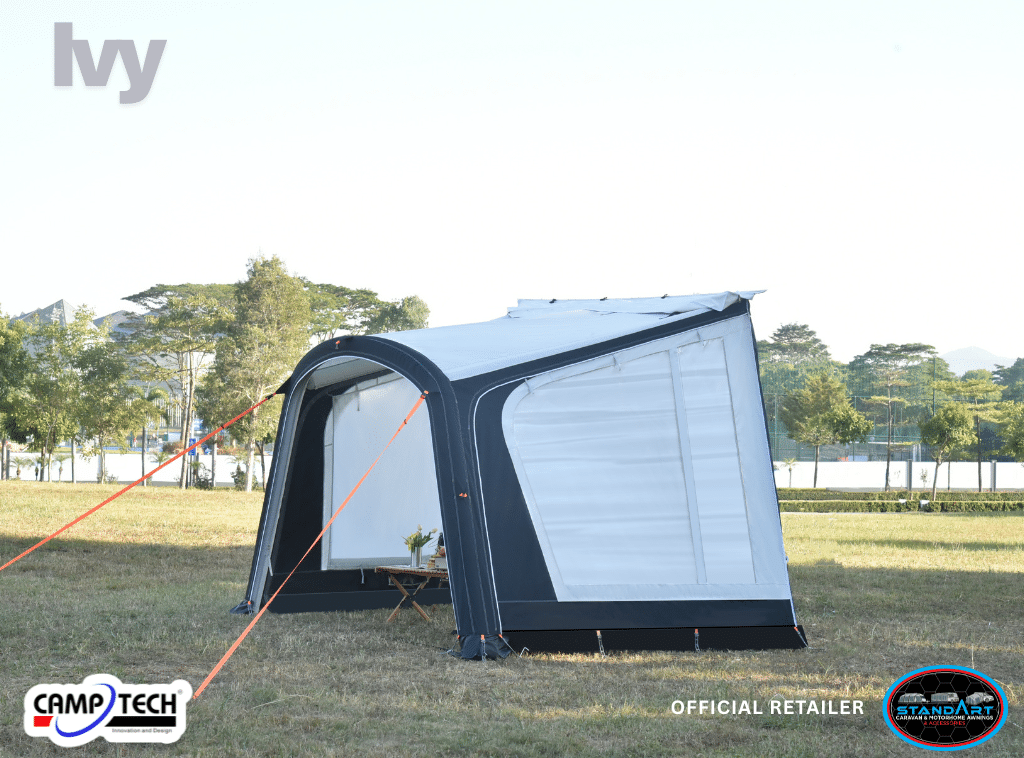 Discover the Camptech Ivy and Camptech Ivy Elite Inflatable Roll Out Awnings. Designed for maximum comfort and ease of use. Manufactured from durable Climatech SY17 fabric (Ivy Elite) or Lightweight 210D fabric (Ivy) – Weather-resistant and long-lasting polyester fabrics and featuring removable side wall panels, the Camptech Ivy is your ideal sun canopy solution for all your camping adventures.