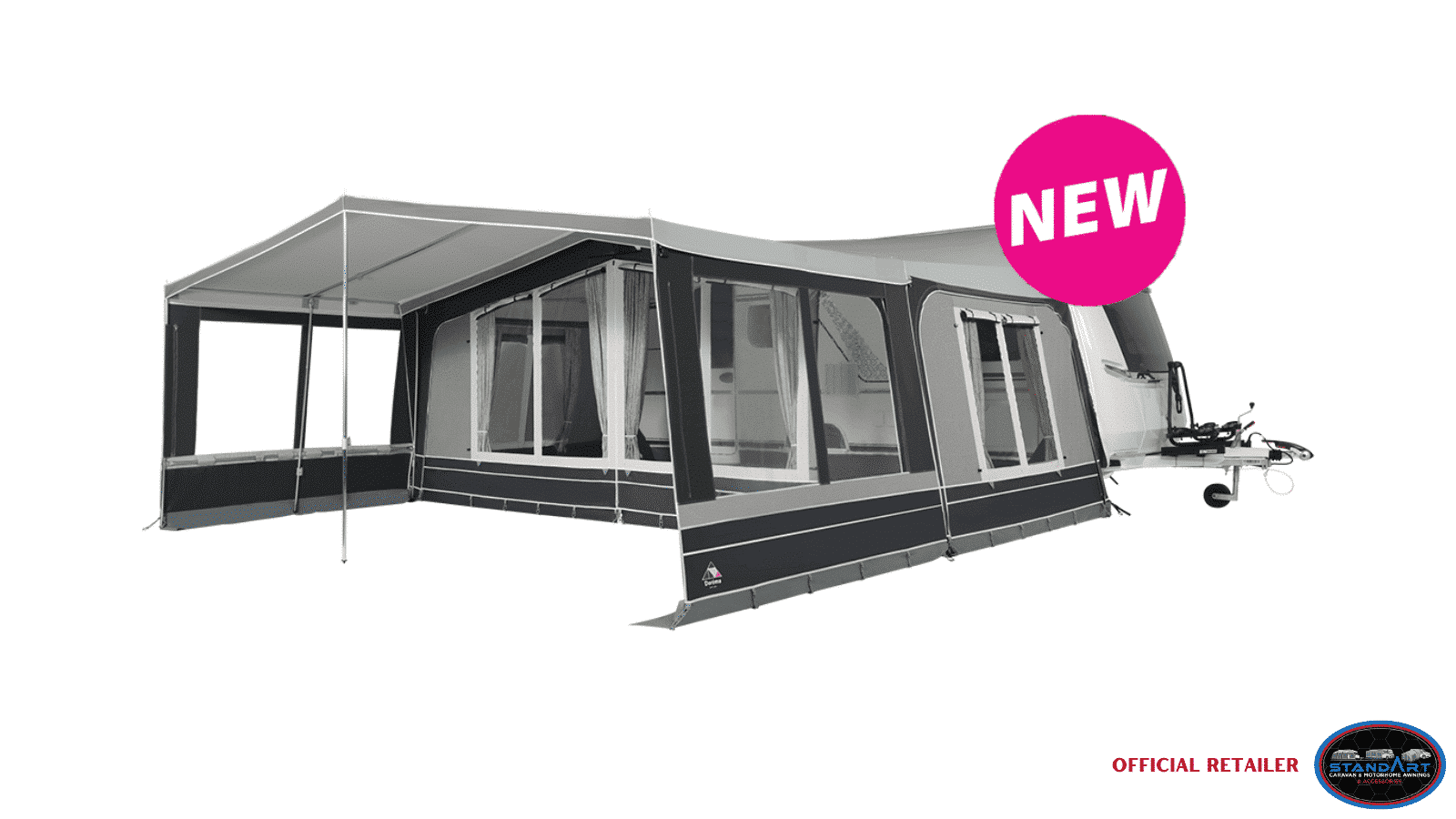 The Dorema Panorama Sun Canopy is a luxury touring canopy offering a generous 240 cm depth of sun protection and a stylish, customisable design. With arched zip-out side panels, five colour options, two robust frame choices, and the SafeLock stability system, it delivers comfort, security, and effortless touring performance.