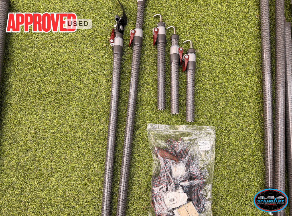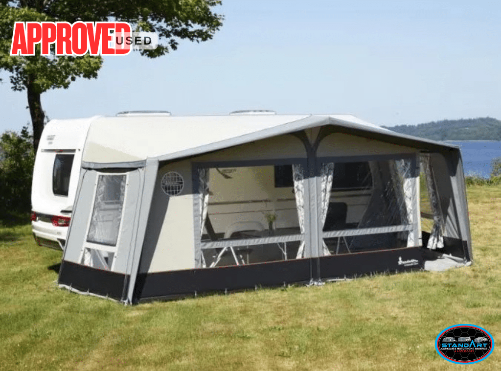 Part of our Approved Used Awnings Range, this 2023 Isabella Ambassador Dawn Awning is available in size 850cm (fits caravans 836-860cm), equipped with G14 Carbon Fibre Frame and in absolutely spectacular condition throughout. Professionally checked over, fully equipped and ready for the campsite. Supplied with a luxury fitted Dometic Cushioned Carpet,  Free Front Mesh Panel Set and 6 months StandArt Guarantee for a complete piece of mind.