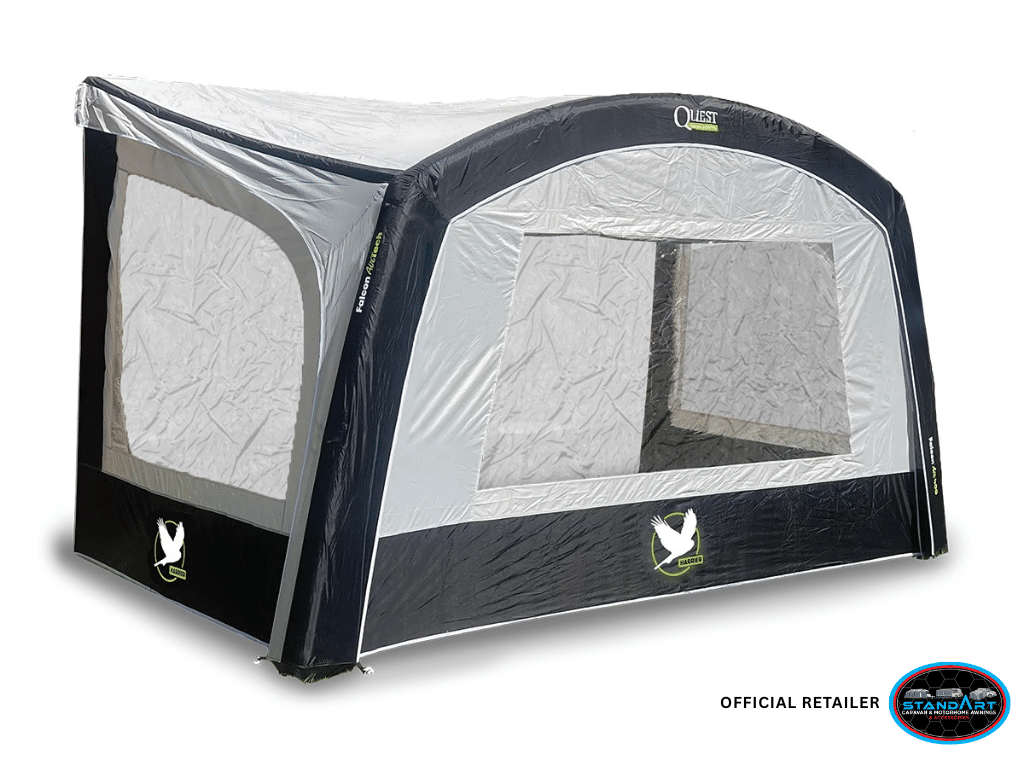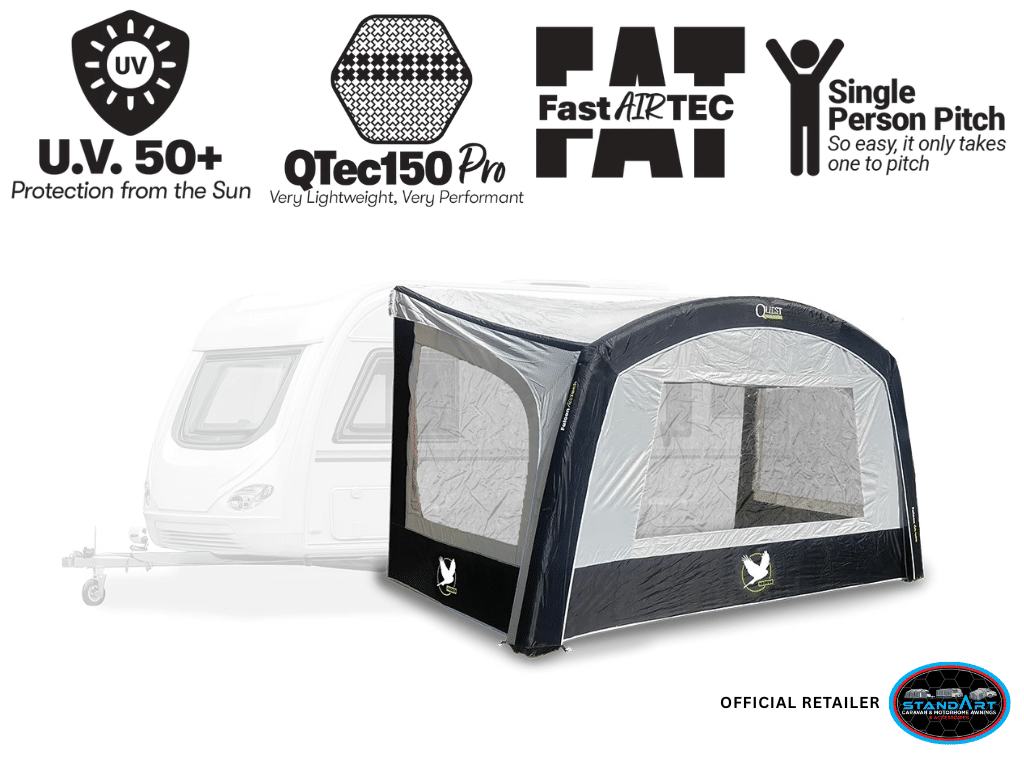 The Quest Harrier 400 Air Canopy is a superb 4‑metre inflatable sun canopy built for caravanners who want maximum covered space with minimum effort. Using Quest’s Fast Air Technology, the canopy inflates from a single air tube, making it genuinely achievable for one person to pitch—from feeding it through the awning rail, to inflating and pegging it out.