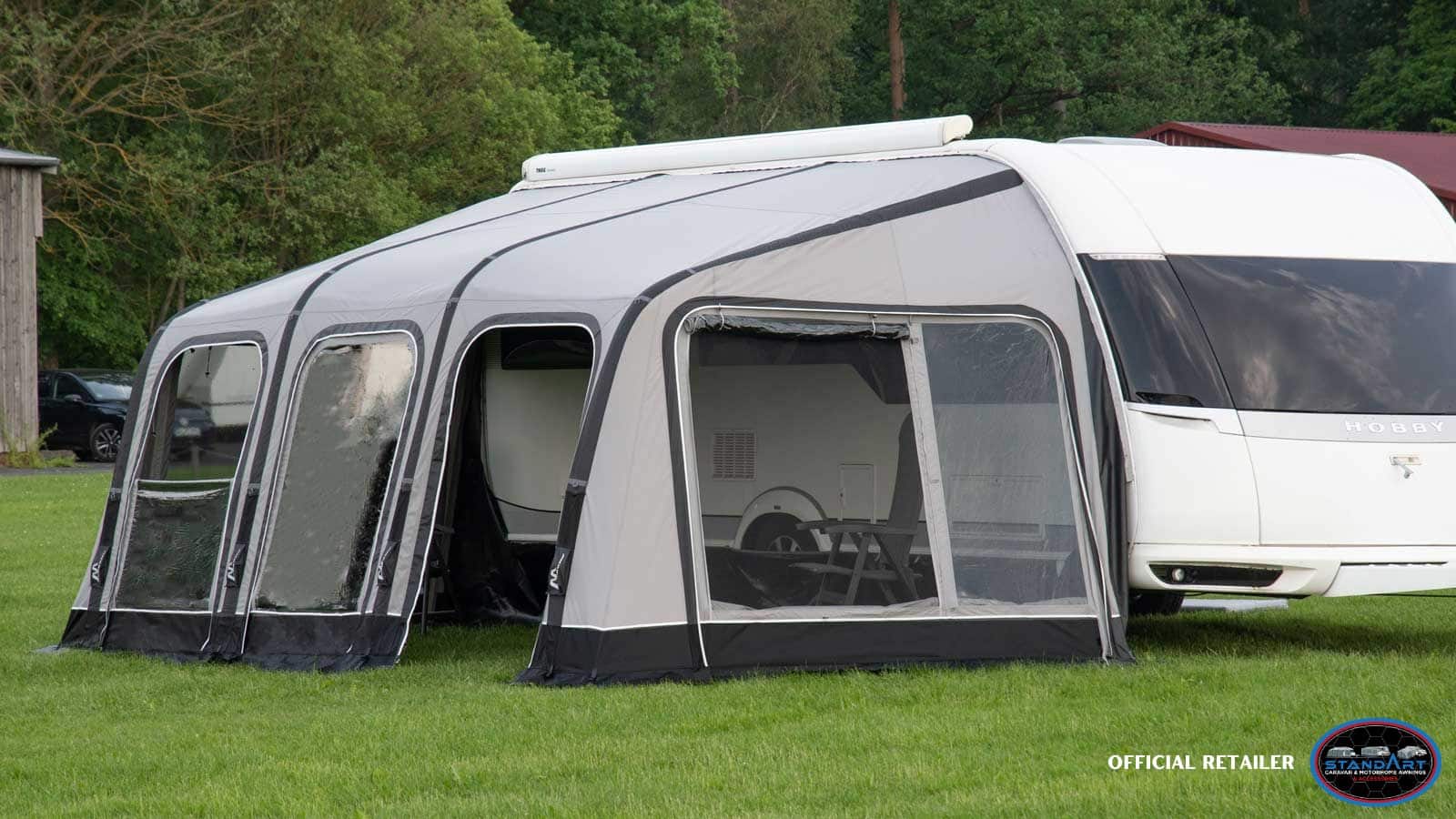 A large, premium inflatable porch awning featuring single-point inflation, durable all-season Climatech SY17 fabric, and a bright, well-ventilated interior—ideal for caravans and motorhomes with fitment heights of 235–250cm.
